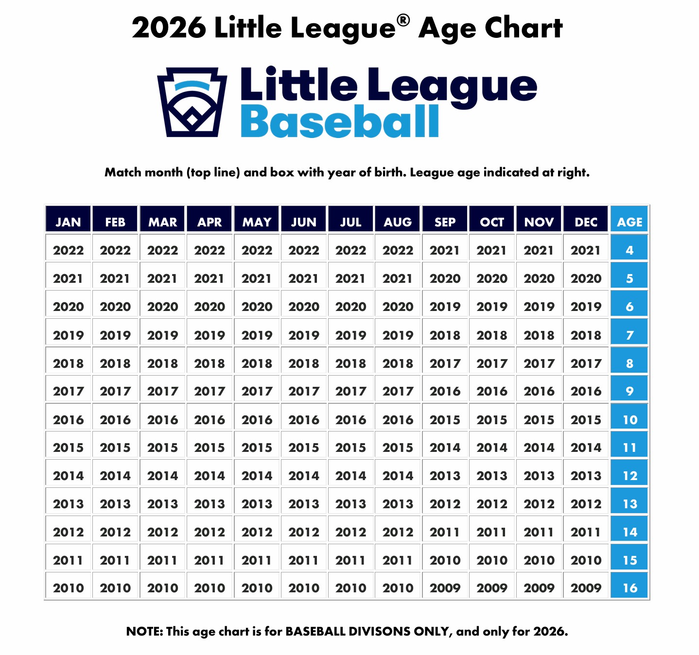 League Age is determined by your child’s age as of August 31st of the calendar year. To confirm your child’s league age for the 2026 baseball season, see the below chart or click here to access the League Age Calculator.